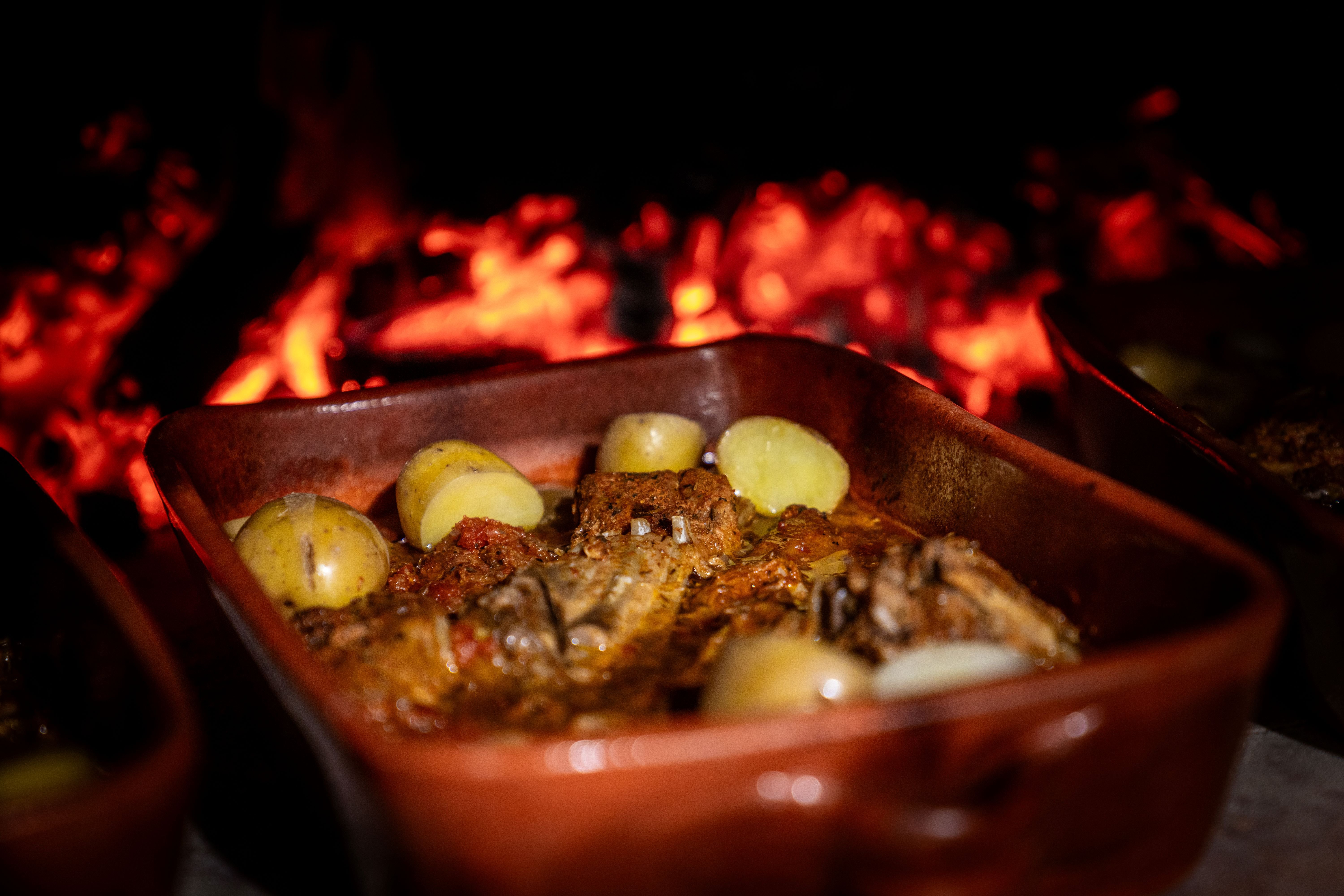 Our specialty is wood-fired roasted kid goat, marinated for 24 hours with salt, herbs, and olive oil from our traditional mill, then slowly roasted in clay pans until the flavor and texture reach perfection.