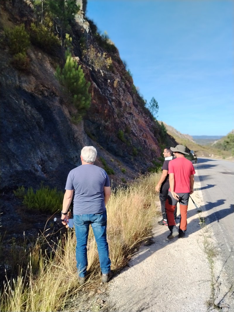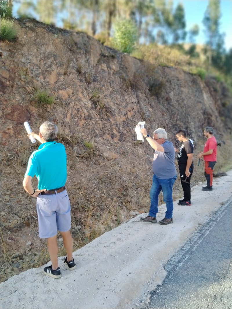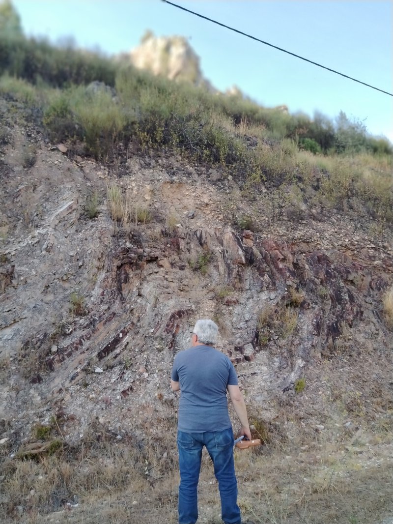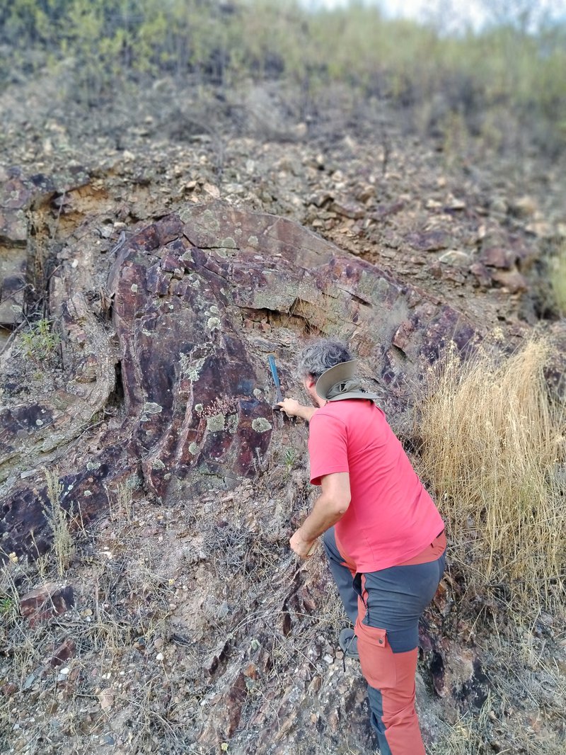 At this location, it can be observed that the oolitic iron horizon (“Camadas de Favaçal”) at the base of the Upper Ordovician Cabeço do Peão Formation lies on top of 9 m of ferruginous quartzite benches included in the Cabril Member of the Ribeira do Casalinho Formation. At the top of this member, remains of eroded pelites from the Carregueira Member of the Ribeira do Casalinho Formation are still visible on the last quartzite bench. Thus, there is an erosive discontinuity, covered by an oolitic iron horizon consisting of chamosite ooids and remobilized material that includes phosphate clasts and nodules with microfossils (chitinous organisms) from the underlying units. This composition shows a period of intense erosion, particularly of the units underlying the Cabeço do Peão Formation. This erosive episode is responsible for the disappearance of the entirety (about 24 m) of the lithologies that constitute the Carregueira Member and, on a macroscopic scale, highlights a clear cartographic discordance between the Ribeira do Casalinho Formation and the Cabeço do Peão Formation, which can be observed, particularly on the northern flank of the larger Amêndoa-Carvoeiro structure.