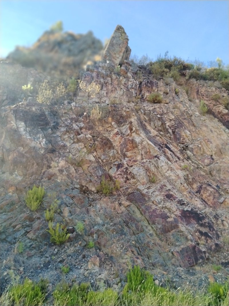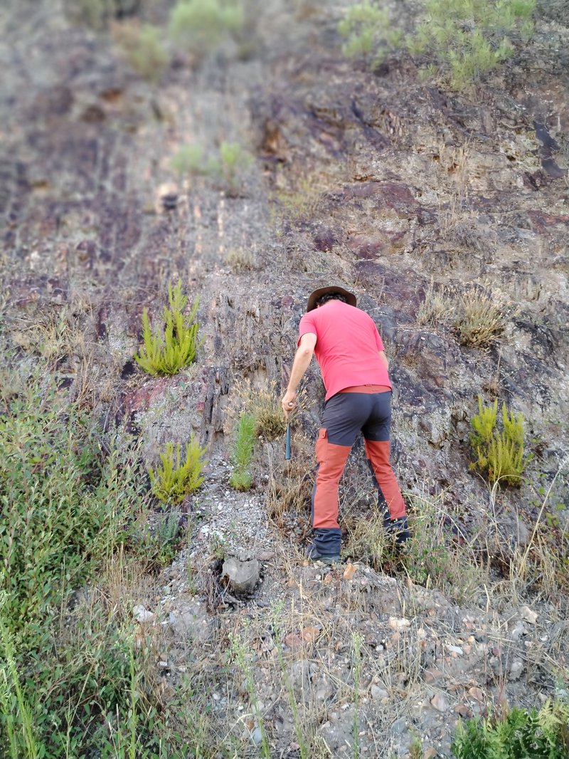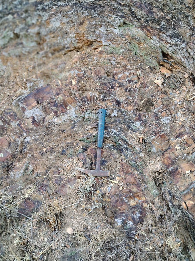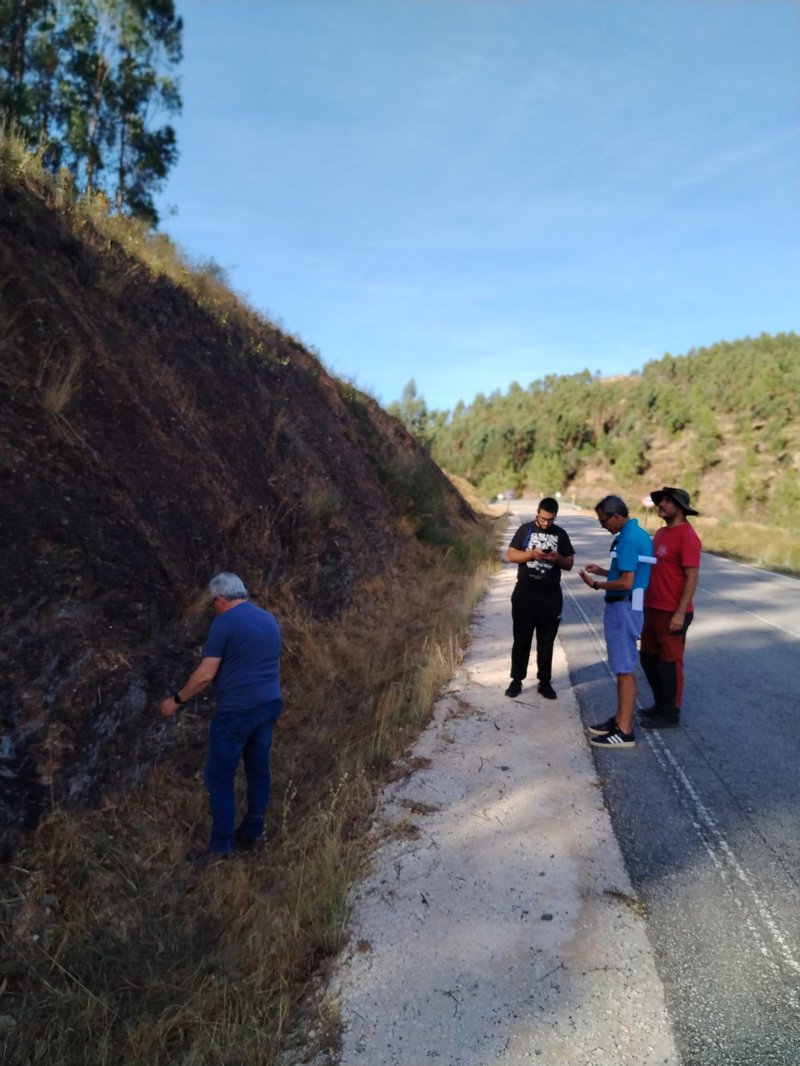 At this location, it can be observed that the oolitic iron horizon (“Camadas de Favaçal”) at the base of the Upper Ordovician Cabeço do Peão Formation lies on top of 9 m of ferruginous quartzite benches included in the Cabril Member of the Ribeira do Casalinho Formation. At the top of this member, remains of eroded pelites from the Carregueira Member of the Ribeira do Casalinho Formation are still visible on the last quartzite bench. Thus, there is an erosive discontinuity, covered by an oolitic iron horizon consisting of chamosite ooids and remobilized material that includes phosphate clasts and nodules with microfossils (chitinous organisms) from the underlying units. This composition shows a period of intense erosion, particularly of the units underlying the Cabeço do Peão Formation. This erosive episode is responsible for the disappearance of the entirety (about 24 m) of the lithologies that constitute the Carregueira Member and, on a macroscopic scale, highlights a clear cartographic discordance between the Ribeira do Casalinho Formation and the Cabeço do Peão Formation, which can be observed, particularly on the northern flank of the larger Amêndoa-Carvoeiro structure.