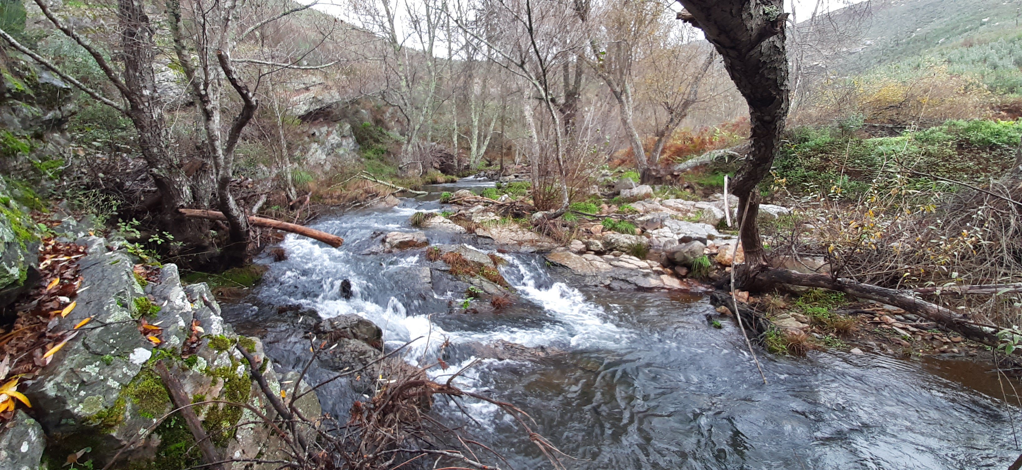 Zona de pequenas quedas de água da Ribeira do Coadouro, envolvidas pelas árvores situadas nas suas margens.